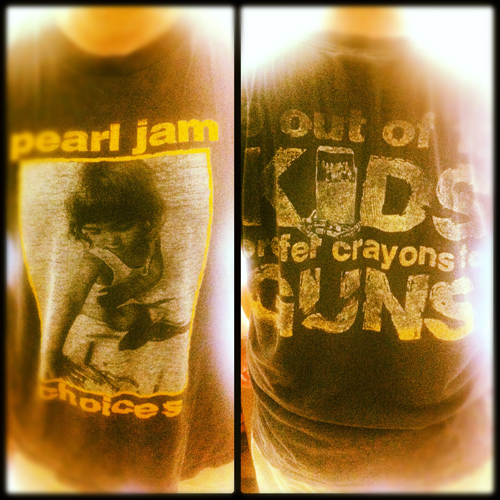 This will be the shirt that I’m cremated in, so it will be there until the end. Fittingly, I feel like it’ll still be going strong till then, much like the band, which I last saw in 2010. And which I’ll see again in about three weeks when it headlines the Midtown Music Festival here in Atlanta. I’ve thought about wearing it to a PJ concert, but I won’t. There are too many other 20-somethings — who were barely born (and plenty of younger kids who weren’t even born) when me and my “Choices” were made — who will be there wearing replica shirts, the damned imposters.